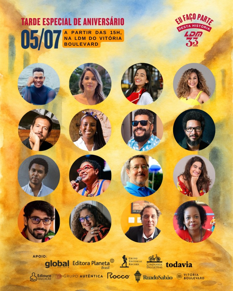 Para comemorar seus 33 anos, a LDM Livraria realiza um “encontrão literário” com 33 autores, neste sábado, 5 de julho, das 15h às 20h, na unidade do Vitória Boulevard. O evento terá “autografaço”, bate-papo com os leitores, sorteio de brindes e feira de livros. A entrada é gratuita e aberta ao público.
